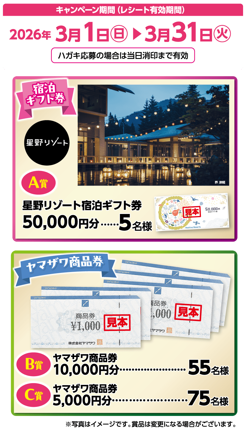 - お一人様何口でもご応募いただけますが、同一レシートでWEBサイトとハガキとの重複応募は出来ません。また、重複当選はございません。